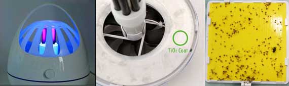 Using these properties of mosquitoes, M9 mosquito trap can decoy and capture mosquitoes both in bright indoors and in dark outdoors by a innovative system: HEAT and A CERTAIN WAVELENGTH RAY produced from the mosquito bulbs installed inside, and CARBON DIOXIDE produced when bulbs are radiated onto TiO2 coated ring plate.
