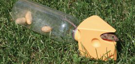 Recycle and reuse an empty plastic water or soda bottle, bait the bottle with peanuts or peanut butter and attach the bottle to the trap’s cheese wedge shaped entrance. |