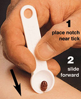 Applying slight pressure downward on the skin, slide the remover forward so the small part of the notch is framing the tick. Continuous forward sliding motion of the remover detaches the tick.
